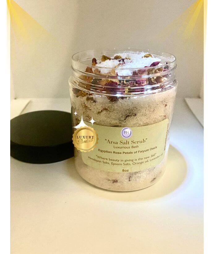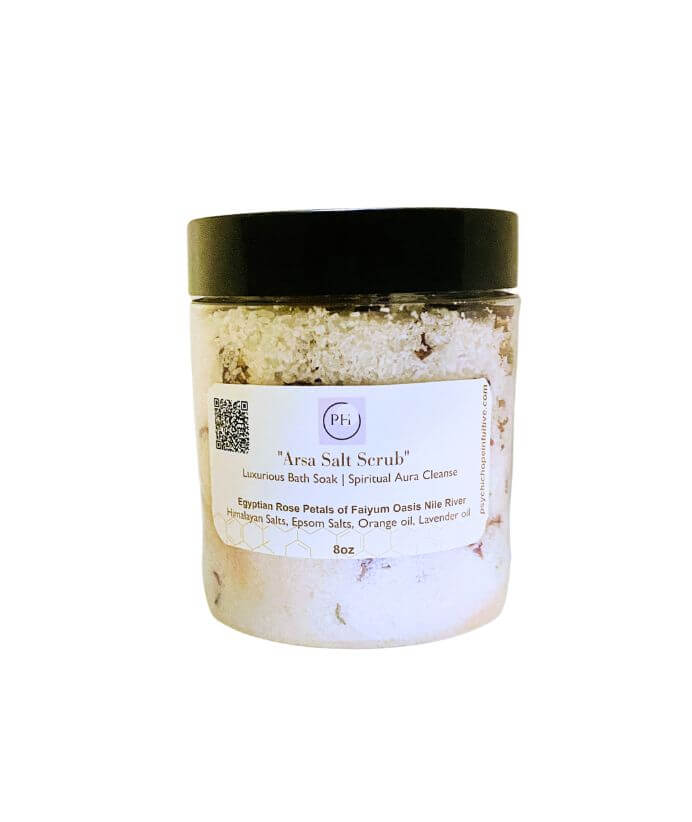 The “Arsa Salt Scrub” is a luxury healing way to remove negative energy, unwanted energy from an ex-partner or other people energies blocking your forward moving motion, as consulted by Chief Oracle, Sheri, in her intuitive psychic sessions have advised for spiritual baths can really assist in release burden of baggage by other people. In this product by MB creators now available to purchase right here on PHI that has a wonderful luxury healing with Himalayan Sea salts with Egyptian Roses from Fayyim Oasis in Egypt near the Nile River that removes energy from the aura and replenishes light that heals and amplify one’s mood.